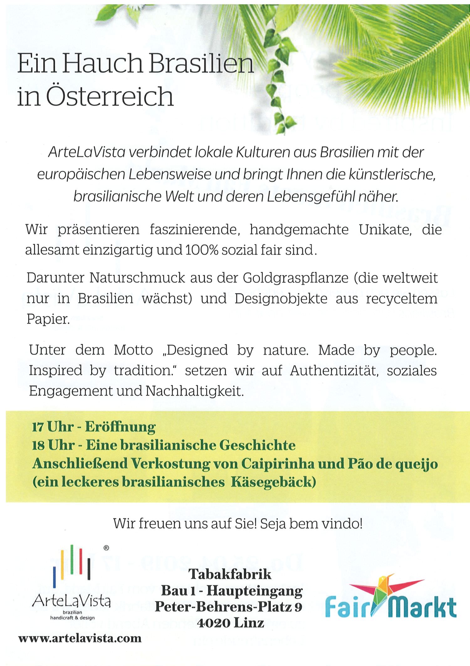 Im kreativen Ambiente vom FairMarkt, auf dem Gelände der Tabakfabrik, laden wir Sie zu einem mitreißenden Abend voller Lebensfreude ein. Wir vermitteln Ihnen spannende Einblicke in die künstlerische Welt Brasiliens und präsentieren Ihnen faszinierende Produkte und echte Geschichten aus einem wunderbaren Land!