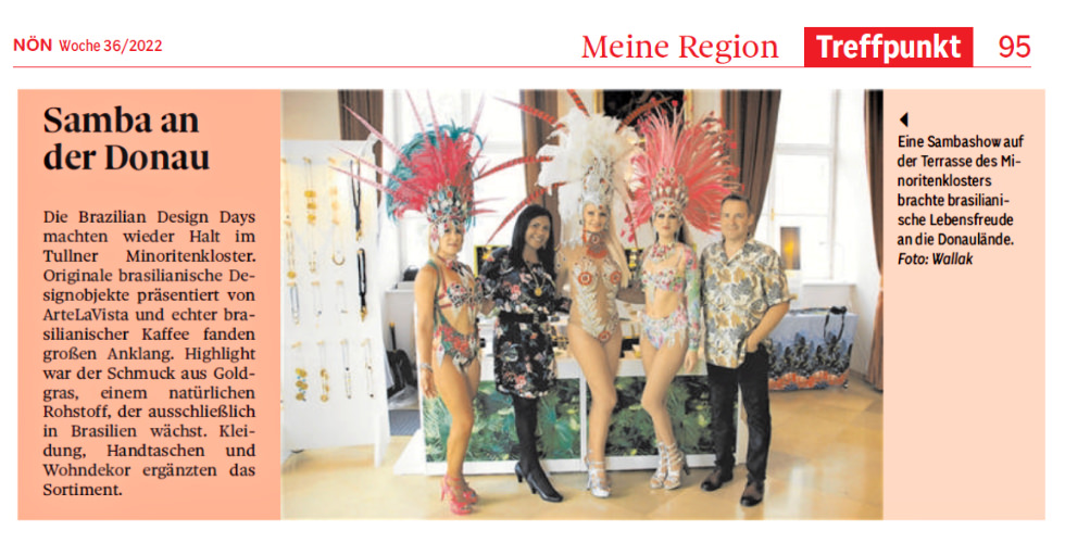 Traumschöne Designobjekte, originaler Kaffee und eine spektakuläre Samba-Show auf der Donau-Terrasse zogen viele tolle Gäste an. Viel Spaß, eine großartige Resonanz und viele schöne Begegnungen haben das Wochenende zu einem außergewöhnlichen Highlight gemacht. Auch mehrere Zeitungen waren vor Ort, und die Niederösterreichischen Nachrichten brachten am 7. September 2022 einen feinen Bericht über die Veranstaltung.