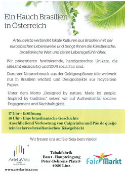 Im kreativen Ambiente vom FairMarkt, auf dem Gelände der Tabakfabrik, laden wir Sie zu einem mitreißenden Abend voller Lebensfreude ein. Wir vermitteln Ihnen spannende Einblicke in die künstlerische Welt Brasiliens und präsentieren Ihnen faszinierende Produkte und echte Geschichten aus einem wunderbaren Land!