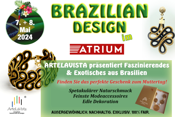 Olá! Im Mai wird es zwei Tage lang wieder brasilianisch im Atrium in Linz. Kurz vor dem Muttertag laden wir Sie ganz herzlich ein, einzigartiges Brasilianisches Design mitten im Herzen von Linz zu erleben. Falls Sie etwas ganz Besonderes für einen lieben Menschen oder natürlich für Sie selbst suchen, finden Sie bei uns ganz sicher etwas absolut Wunderbares und Besonderes.