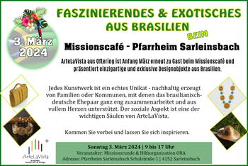 Im Pfarrheim in Sarleinsbach findet am 3. März das Missionscafe statt. Wir freuen uns sehr, zum zweiten Mal bei dieser schönen und gleichzeitig sozialen Veranstaltung dabei zu sein. Der soziale Aspekt ist eine der wichtigen Säulen von ArteLaVista, daher sind wir äußerst stolz mitmachen zu dürfen.
